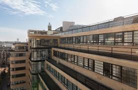 Its design features curved corners, long horizontal window bands, and smooth faience cladding that emphasise movement and efficiency. The steel frame structure allowed larger office floors and greater natural light, reflecting the shift toward more functional and technologically advanced office buildings in the late 1930s.