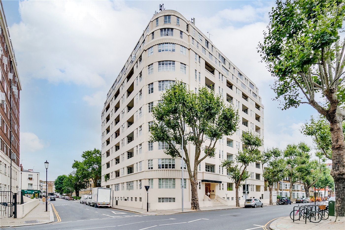 Its design uses clean horizontal lines, symmetrical façades, and restrained decorative elements typical of London’s residential Art Deco architecture. The building demonstrates how the style was adapted for practical apartment living while maintaining a strong visual presence within the surrounding streetscape.