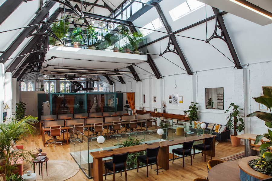 A bright, biophilic office interior showcasing large skylights, expansive wooden flooring, and a variety of indoor palm plants South London has a vibrant and community-focused coworking scene. Peckham buzzes with grassroots culture and creative energy. London Bridge and the Southbank blend professional credibility with cultural access. Putney and South West London provide a more relaxed, lifestyle-oriented work environment.