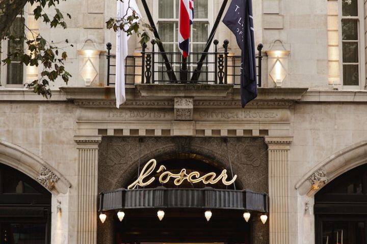 L’oscar London hotel entrance, showcasing the ornate stone facade and the brightly lit, curved neon sign above the doorway L’oscar London is one of the city’s most distinctive boutique luxury hotels, set inside a restored Baroque-style former Baptist church. The interiors by Jacques Garcia are rich, dramatic, and theatrical, think deep velvets, dark woods, jewel tones, and mood lighting. It feels glamorous, intimate, and unlike anywhere else in London.