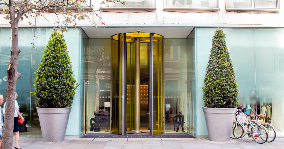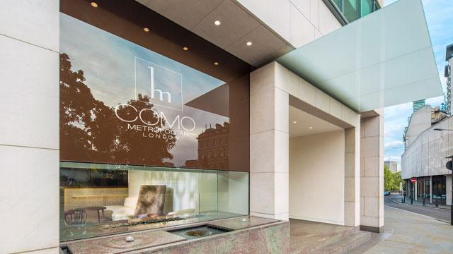 COMO Metropolitan London hotel entrance, showing a large reflective glass window with the hotel logo and a modern white canopy COMO Metropolitan blends sleek modern design with timeless elegance. The rooms are spacious and minimalist, yet warm, with natural fabrics and subtle touches that make you feel at home. I love the sense of calm here, even in the heart of bustling Mayfair.