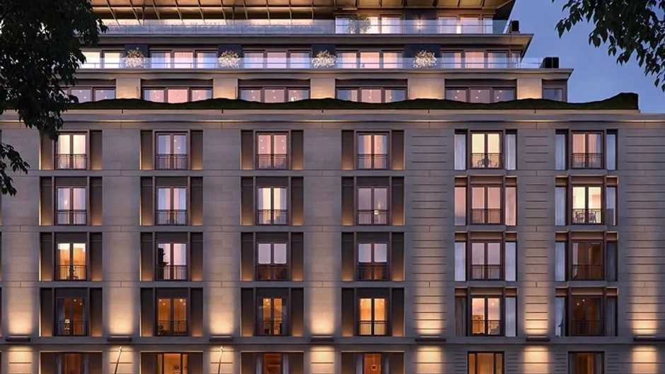 A rooftop view of London's skyline at sunset, showing the historic dome of Raffles London at The OWO and the Houses of Parliament in the background Raffles London opened in 2023 in the historic Old War Office building. Its 120 rooms combine original architectural details with contemporary luxury, offering high ceilings and views over Horse Guards Parade.