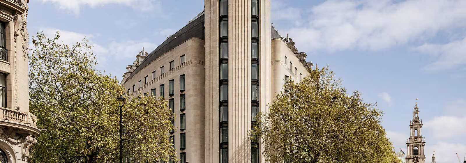 Grand hotel building with a traditional design The Trafalgar St. James offers boutique luxury with 131 rooms featuring contemporary design and bold colors. The rooftop bar provides iconic views of London and Nelson’s Column.