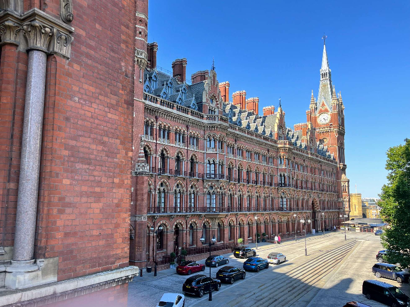 Street view of the St. Pancras Renaissance Hotel, a famous London landmark and former Midland Grand Hotel, with parked cars below This Victorian Gothic hotel blends historic architecture with contemporary design in 245 rooms. Its location at St. Pancras International is perfect for Eurostar travelers and easy London access.