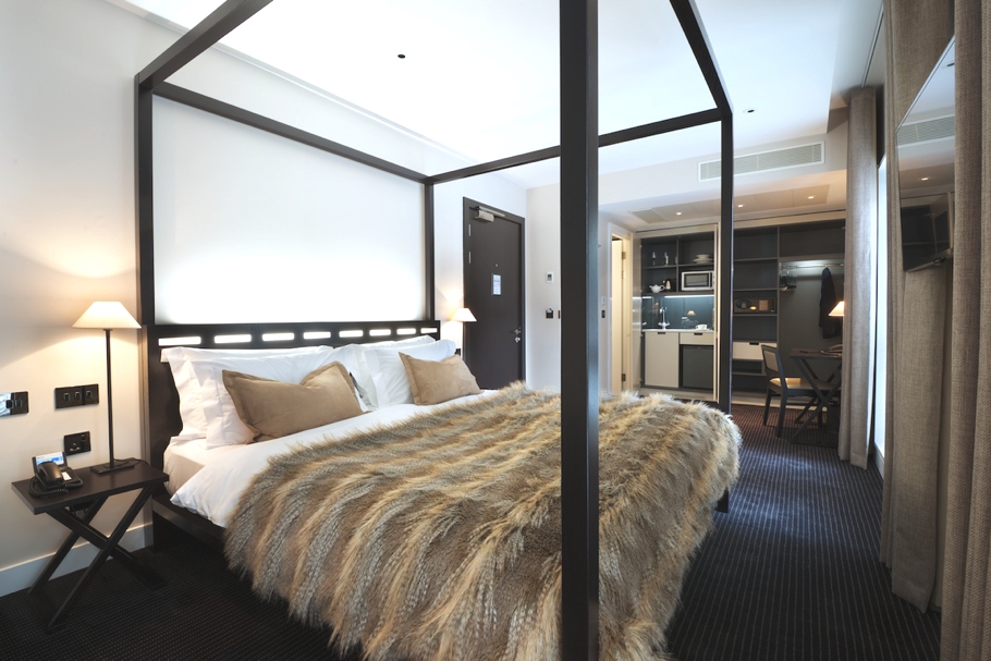 Modern hotel room interior featuring a dark four-poster bed with a luxurious faux fur throw blanket and white bedding The Nadler Soho offers boutique luxury with 137 rooms that are modern, compact, and smartly designed for convenience. Perfect for travelers who want style without excess.