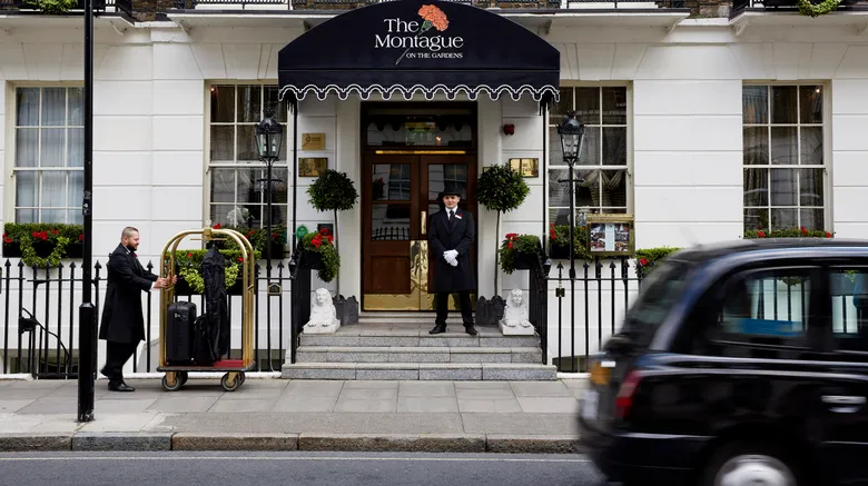 The Montague on The Gardens hotel entrance, featuring a black awning, white facade, and a doorman and bellhop with luggage The Montague on The Gardens feels like a charming English country house in the city. Its classic Georgian architecture and garden views make it peaceful and inviting. I especially love strolling through the private gardens in the morning.