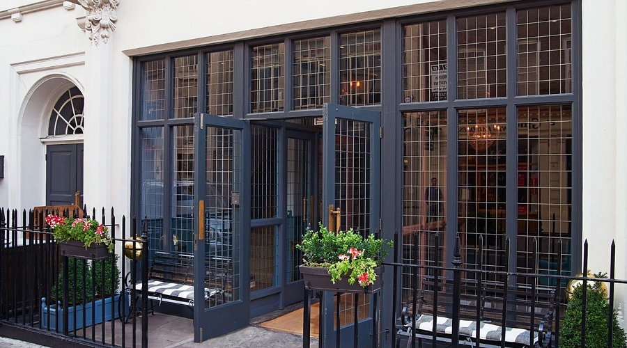 Dean Street Townhouse hotel and restaurant entrance in Soho, London, featuring large grid-patterned windows and a black iron fence Dean Street Townhouse offers intimate luxury in the heart of Soho. The rooms feel like a private townhouse, blending vintage style with modern comfort. I enjoy the quiet retreat it offers despite being in one of London’s busiest neighborhoods.