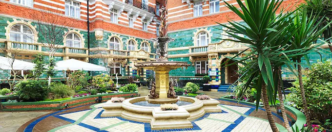 Lush hotel garden space at St. James' Court, A Taj Hotel, with palm-like plants, manicured hedges, and an elegant central water feature St. James’ Court is a refined luxury hotel with 301 rooms offering traditional elegance and modern comforts. It feels calm and private, despite its central location.