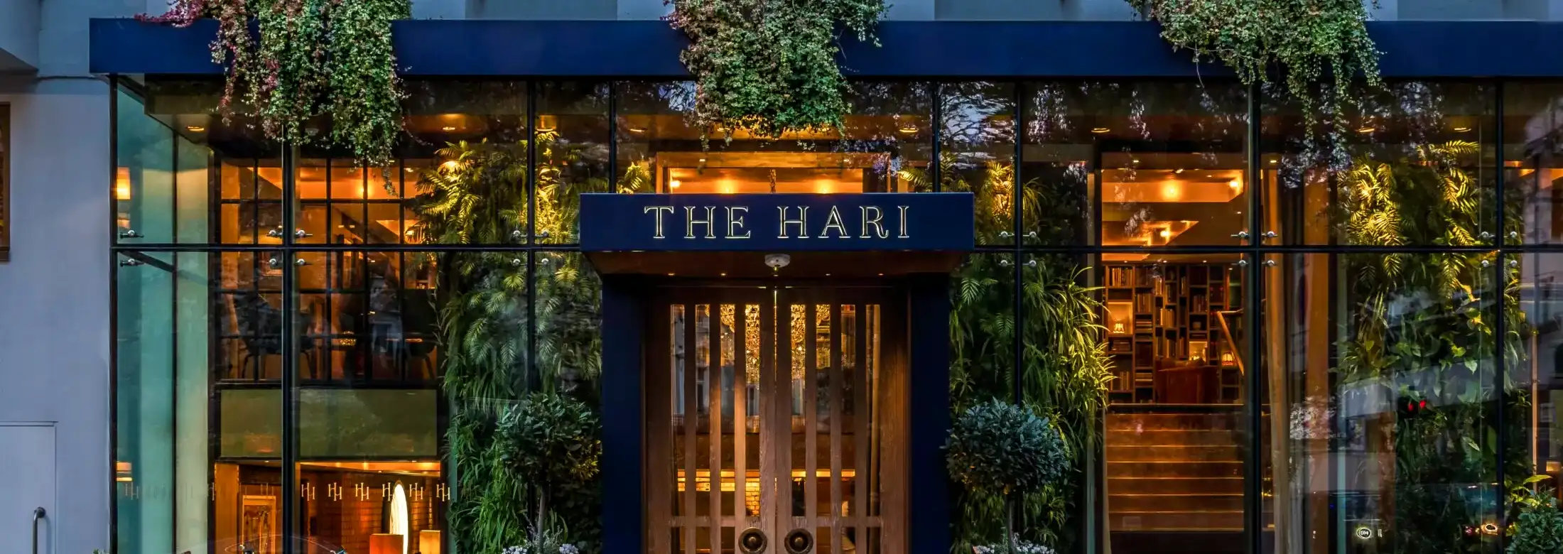 Modern and elegant entrance of The Hari hotel in London, featuring dark glass, a clear sign, and lush green foliage growing overhead The Hari is a contemporary boutique hotel with 95 rooms designed for modern luxury. Interiors are sleek, stylish, and comfortable, offering a quiet retreat in central London.