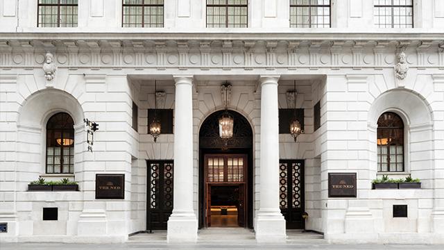 Front view of The Ned, a luxury London hotel and restaurant venue, with its name plaques visible on the white stone The Ned transformed the historic Midland Bank building into a luxury hotel, private members club, and collection of restaurants. Its 252 rooms on the upper floors blend 1920s-inspired design with modern comfort, offering a stylish yet cozy stay.