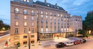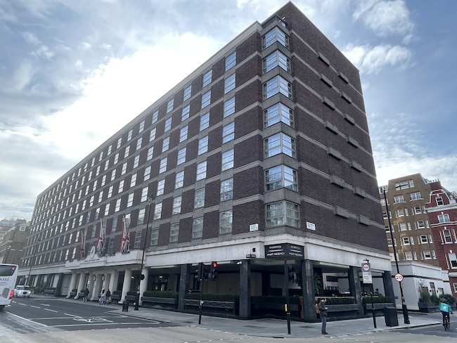 Hyatt Regency London The Churchill hotel exterior, a large brown brick building on a city corner street with flags flying The Hyatt Regency The Churchill combines classic British style with modern luxury. The rooms are elegant, spacious, and perfect for business or leisure travelers. I appreciate the calm, understated sophistication throughout the hotel.