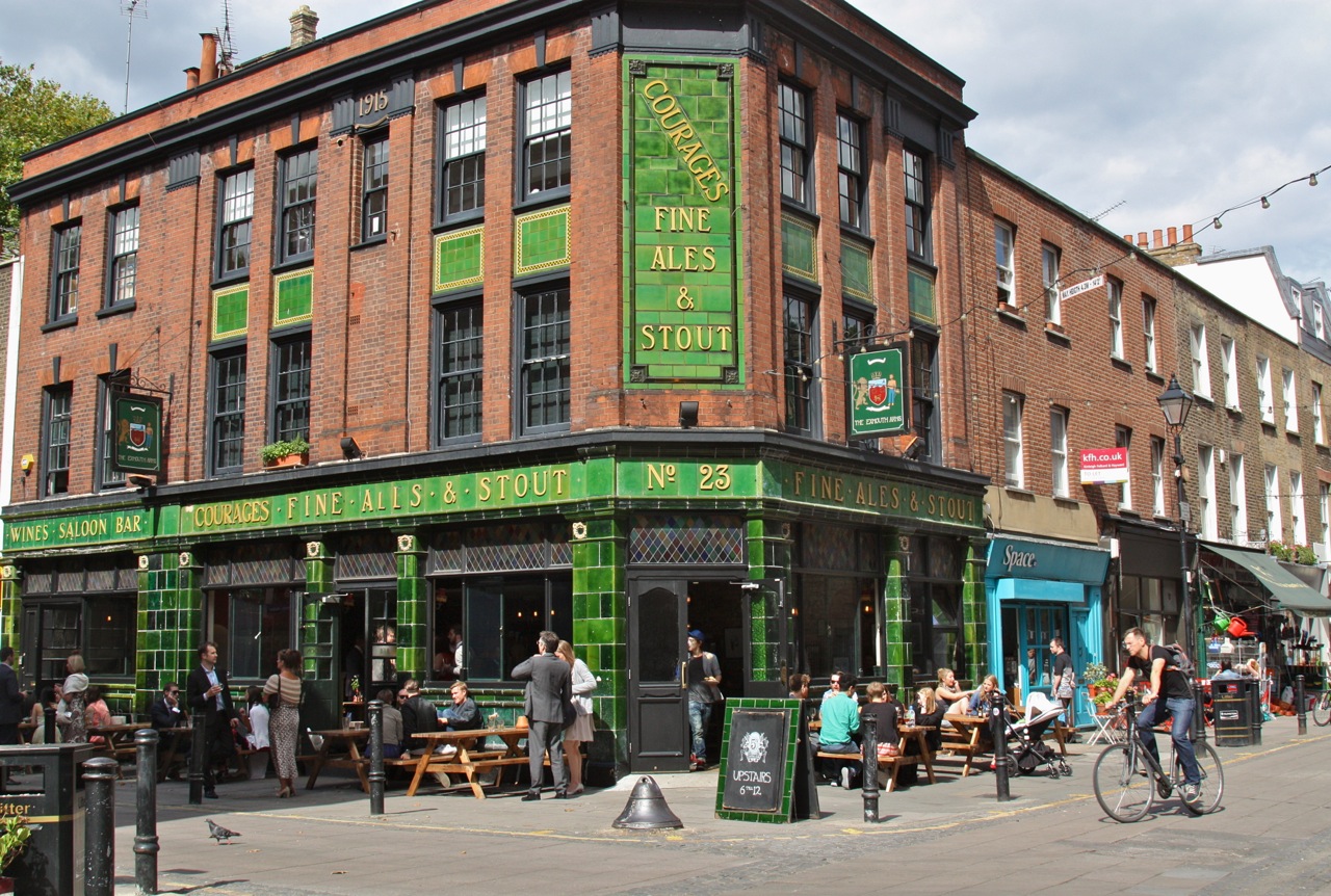 Corner view of a traditional London pub with "Courages Fine Ales & Stout" signage and distinctive green emerald tiles at Exmouth Market Exmouth Market is a lively street market with a mix of vintage clothing stalls, antiques, and artisan crafts. The market comes alive on weekends when retro fashion, handmade jewelry, and unique collectibles line the streets. Alongside these, you can enjoy street food stalls, independent cafés, and local artists displaying their work, creating a vibrant and colorful environment.