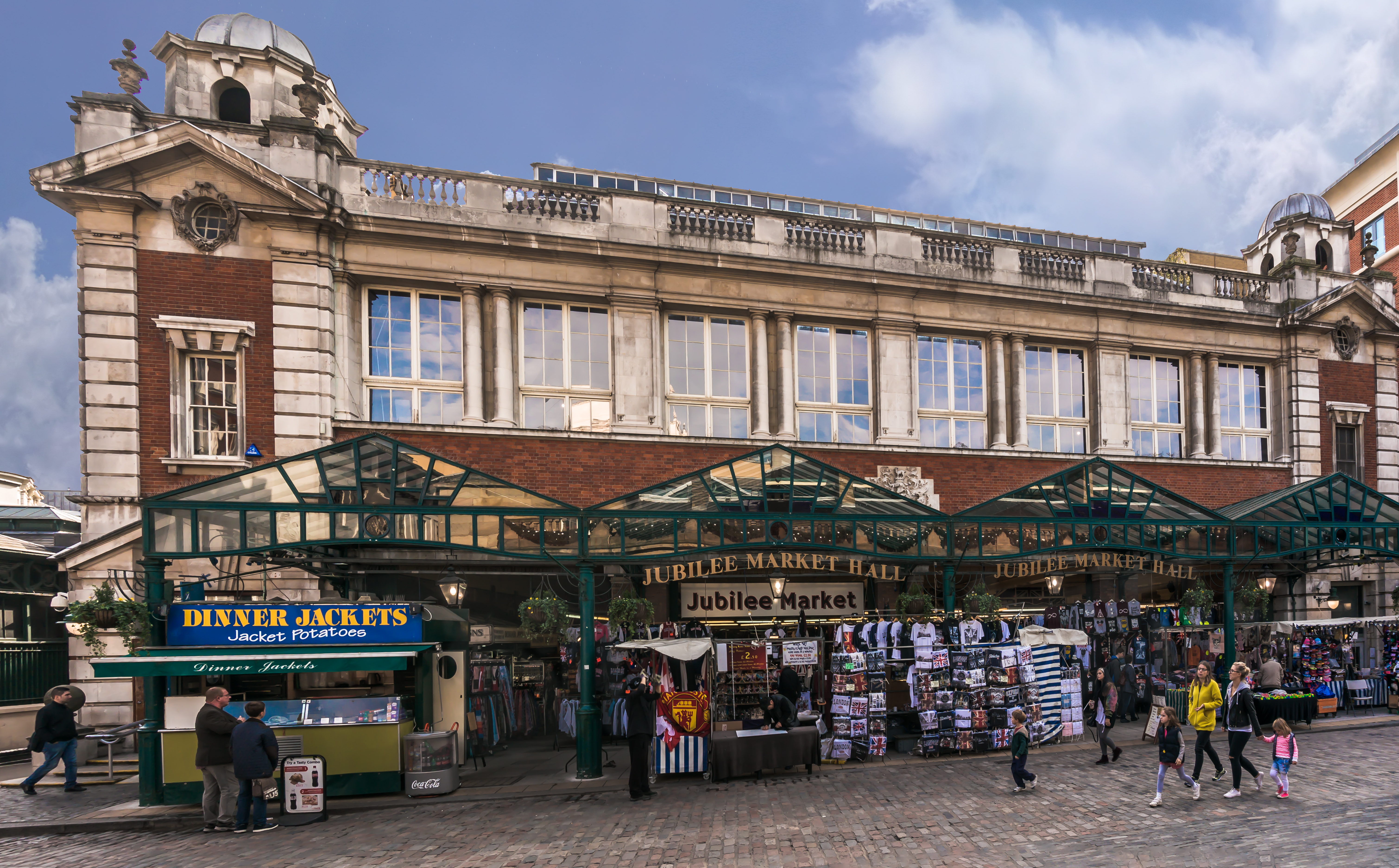 Exterior view of Jubilee Market in London with the "Dinner Jackets" baked potato stand and vendors selling clothing and souvenirs Jubilee Market is an indoor market in Covent Garden, offering something for everyone. On Mondays, it becomes an antiques market, opening at 5am for serious collectors. From Tuesday to Friday, the market turns into a general market selling souvenirs, stamps, and collectibles. On weekends, it focuses on arts and crafts, including vintage clothing, dolls, paintings, and handmade items.