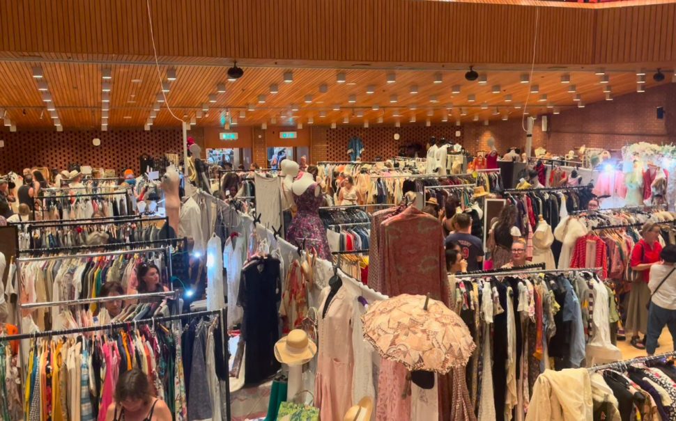 Frock Me Fashion Fair, featuring rows of high-density clothing racks, mannequins, and shoppers browsing retro apparel in a large hall. Frock Me! Vintage Fashion Fair is a Sunday-only market known for its theatrical and creative atmosphere. Curated by Matthew Adams, a costume and fashion expert with decades of experience, it is a paradise for collectible vintage clothing, fashion brands, Biba dresses, Chanel accessories, French textiles, and costume jewelry. As one of the standout events among London vintage clothing markets, it attracts both seasoned collectors and casual shoppers looking for unique, high-quality pieces. Many traders come from the theatre and costumery world, giving the fair a unique, artistic vibe.