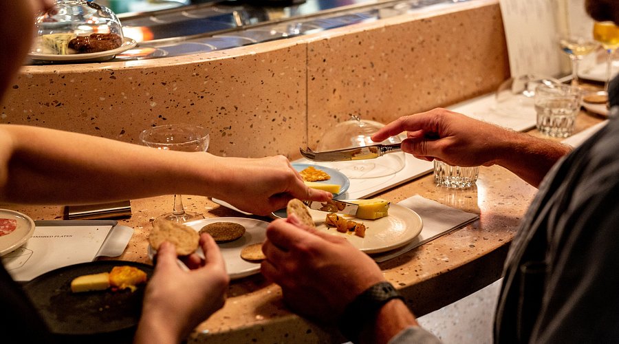 Customers dining at a speckled stone counter with small plates of artisan cheese under glass cloches on a conveyor belt Seven Dials Market is a vibrant food hall that brings together flavours from around the world. Just an 8-minute walk from Piccadilly Circus, it’s perfect if you’re looking for variety and want to try multiple cuisines in one spot. Popular choices include vegan tacos, loaded burritos, or falafel wraps, each stall offering generous portions and bold, fresh flavours.