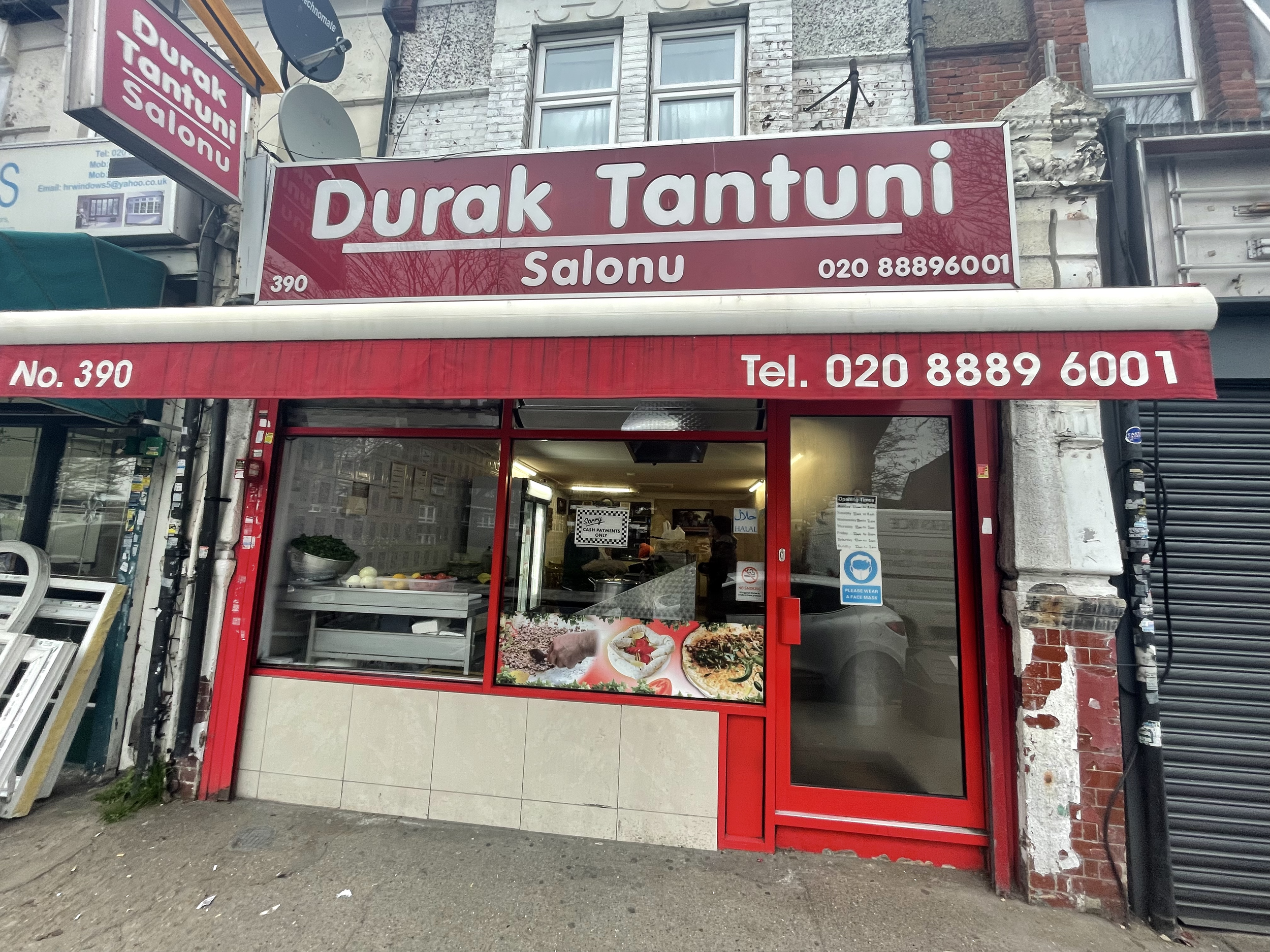 Durak Tantuni Salonu in London, showcasing the restaurant's phone number, 020 8889 6001, and a red awning over the glass entrance Durak Tantuni offers hearty Turkish wraps packed with grilled meats, fresh vegetables, and bold spices. Only a 7-minute walk from Piccadilly Circus, it’s perfect for street-food lovers who want a filling meal without overspending. The chicken tantuni wrap is soft, flavorful, and generously sized, giving excellent value for money.