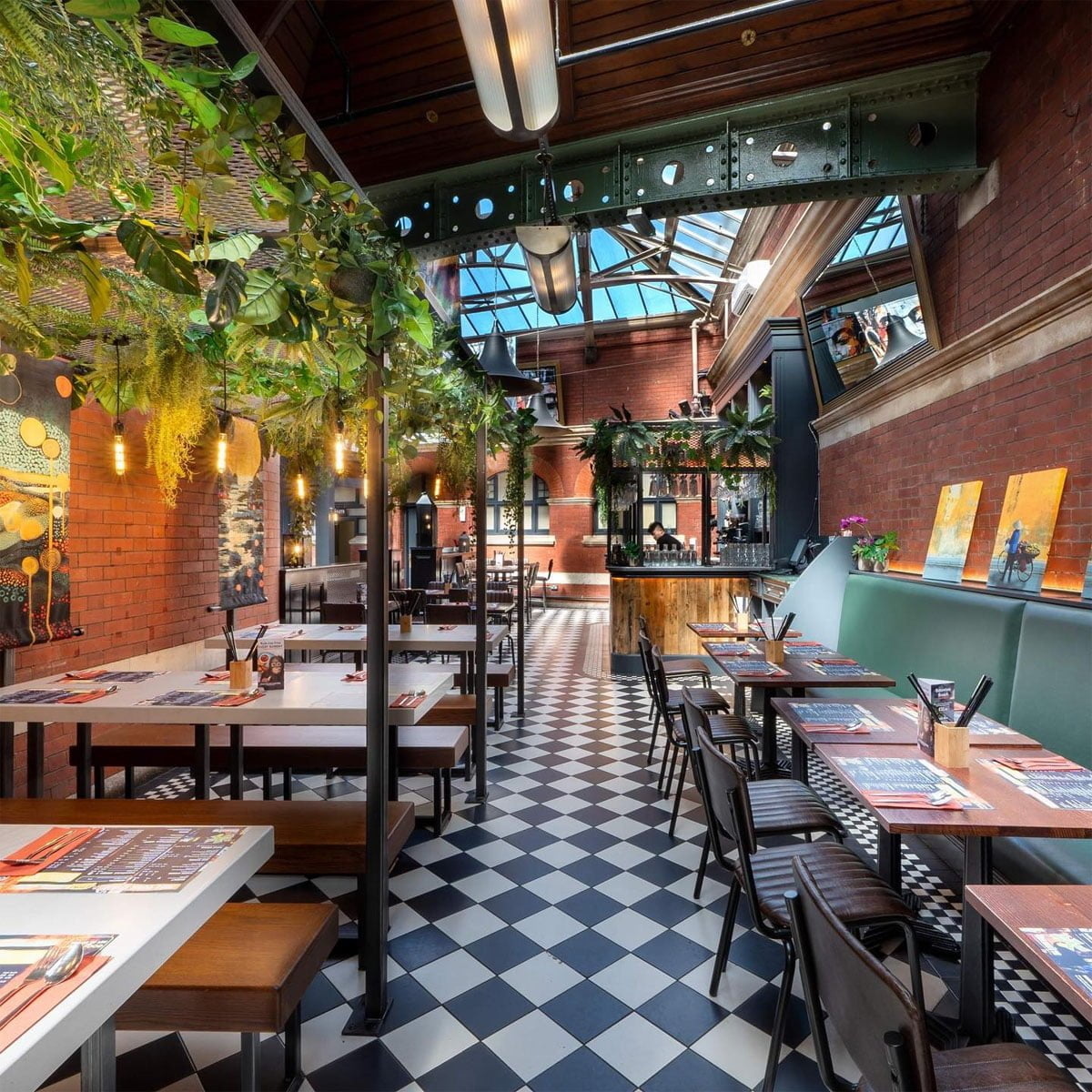 Banana Tree restaurant featuring a black and white checkered floor, industrial brick walls, and lush green plants hanging from an indoor trellis Banana Tree offers a lively, approachable take on pan-Asian food, blending flavours from Thailand, Malaysia, and Vietnam. Just a 6-minute walk from Piccadilly Circus, it’s a great spot for both lunch and dinner. The chicken satay skewers with peanut sauce are a perfect choice, packed with rich, slightly sweet flavour and served with rice that soaks up every bit of the sauce.