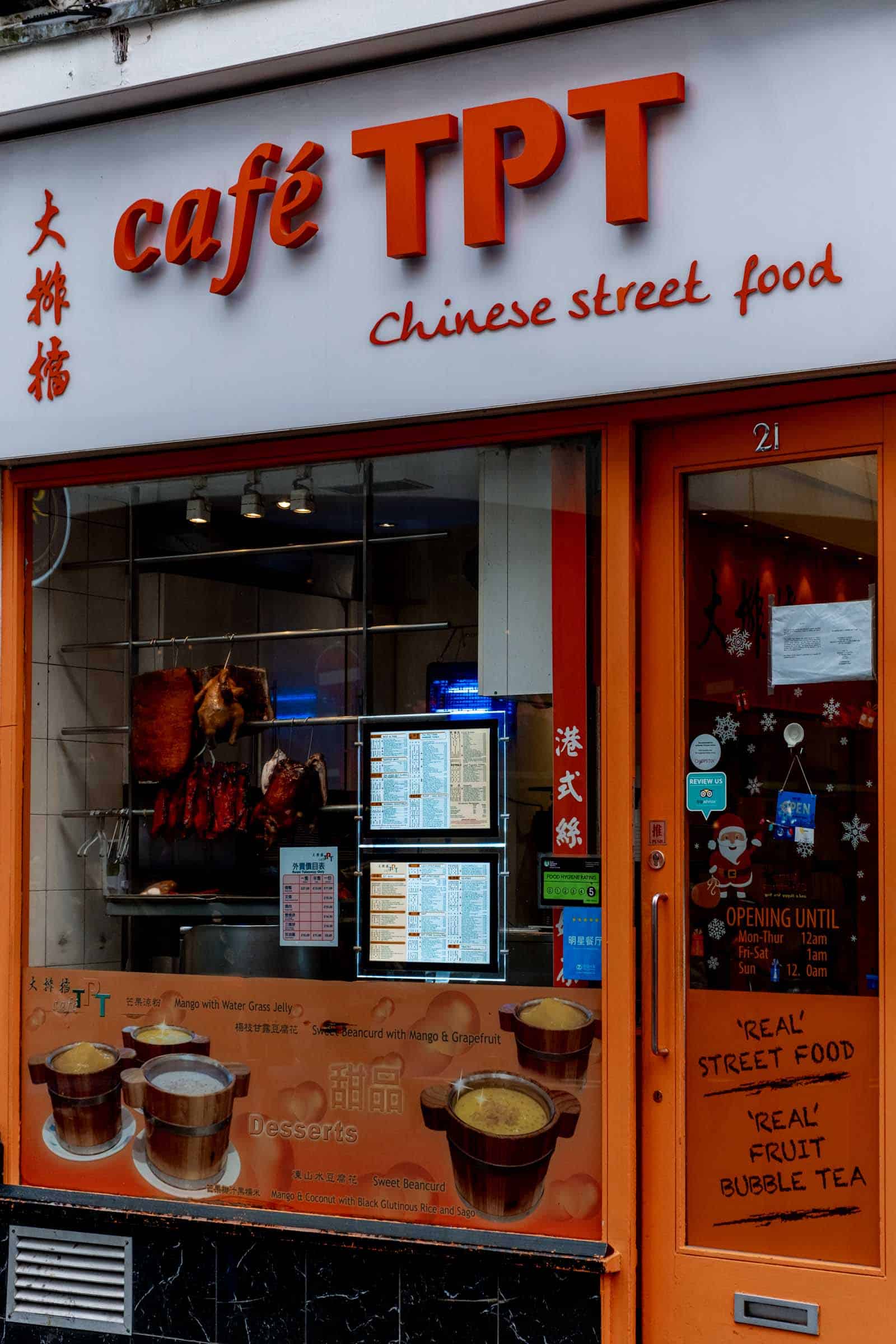Café TPT storefront window showcasing traditional roasted meats, digital menu boards, and posters for specialty desserts like Mango with Water Grass Jelly Cafe TPT is a tiny hidden gem on Wardour Street, known for its Macau-style street food. A 4-minute walk from Piccadilly Circus, it’s perfect for a quick, budget-friendly meal. The baked pork chop rice is the standout dish, featuring a crispy, slightly caramelised crust atop fragrant rice and a savoury sauce.