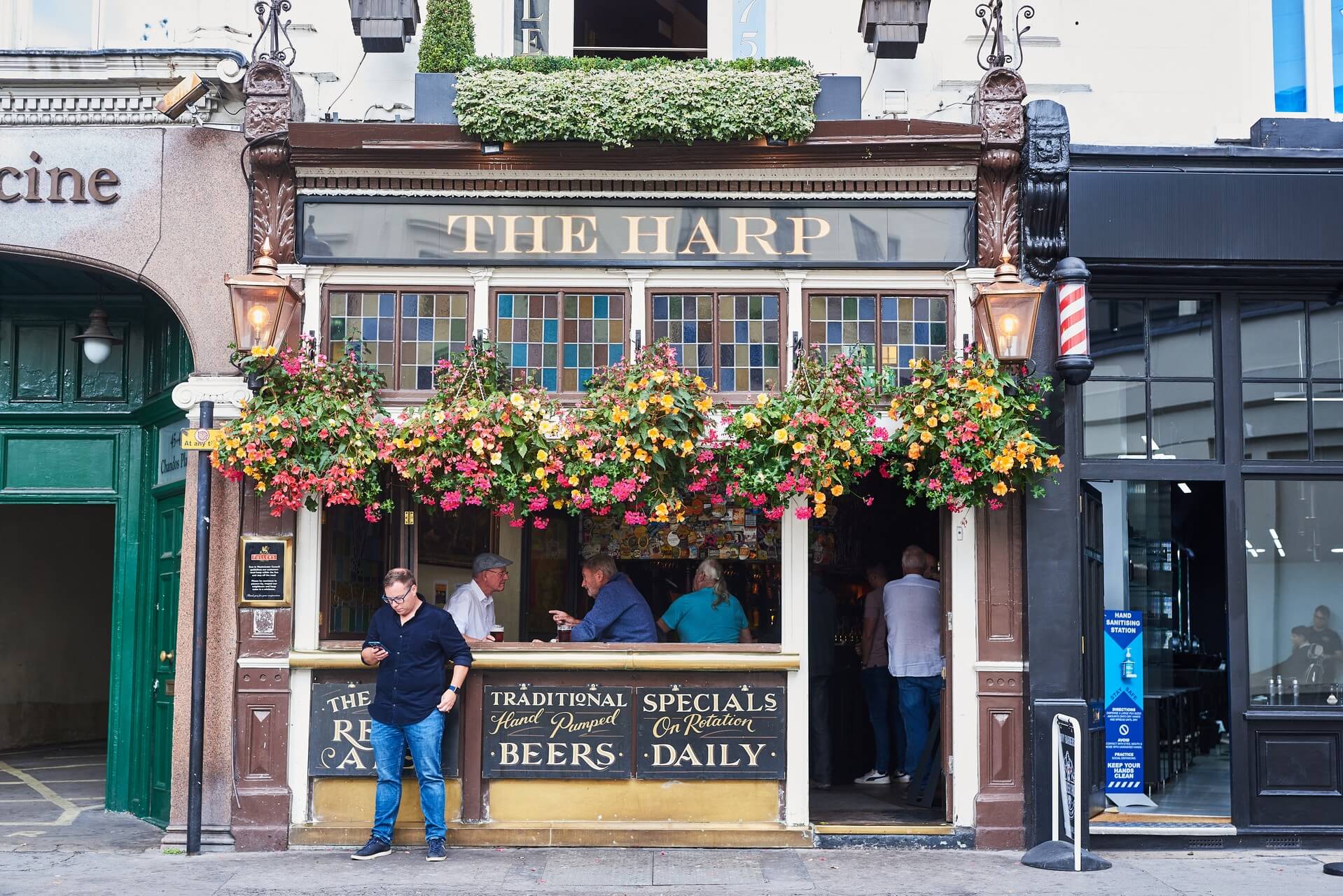 Exterior of The Harp pub in London featuring traditional stained glass and vibrant hanging flower baskets If you want to escape the neon and find a "proper" London pub, walk 7 minutes toward Charing Cross to The Harp. This multi-award-winning ale house is famous for its stained glass, flower-covered exterior, and most importantly its legendary sausage baps and pork pies. While most pubs in the West End serve overpriced "gastro" burgers, The Harp keeps it simple and cheap with high-quality British snacks that have a cult following.