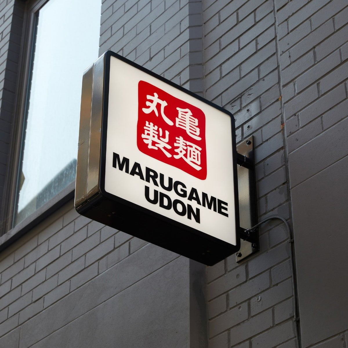 The official logo of Marugame Udon, a world-famous Japanese noodle chain, displayed on a modern projecting wall sign against a neutral grey architectural background. Marugame Udon brings a cafeteria-style Japanese dining experience with hand-pulled udon noodles and tempura options. A 6-minute walk from Piccadilly Circus, it’s a top pick for lunch or a quick dinner. The Beef Udon with tempura prawns is a classic choice, featuring a rich broth, chewy noodles, and perfectly fried toppings.