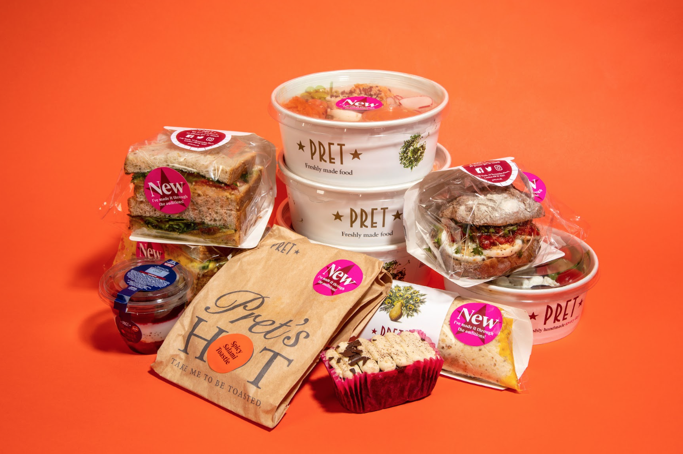 Pret A Manger food items stacked against a bright orange background, including pre-packaged sandwiches, salad bowls, a wrap, a fruit pot, and a "Pret’s Hot" toastie bag When hunger strikes and time is tight, Pret-style cafés offer predictable, grab-and-go sandwiches, salads, and snacks. Within 5-10 minutes from Piccadilly Circus, depending on the branch, they’re convenient for a quick bite between sightseeing or work commitments. The chicken Caesar wrap or vegan falafel salad offers decent portions at a small cost, perfect for filling your stomach fast.