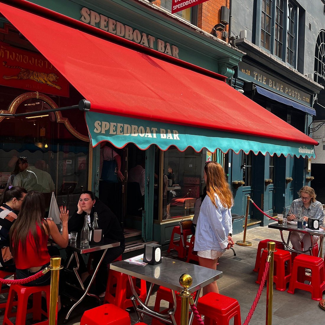 Exterior of Speedboat Bar in London featuring a bright red awning and customers dining on red stools at sidewalk tables Speedboat Bar is a lively spot for Thai stir-fries and noodles. Just a 5-minute walk from Piccadilly Circus, it’s perfect for a quick, flavorful meal. Try the pad Thai or green curry with chicken, both full of fresh herbs and a balanced blend of sweet, salty, and spicy flavours.