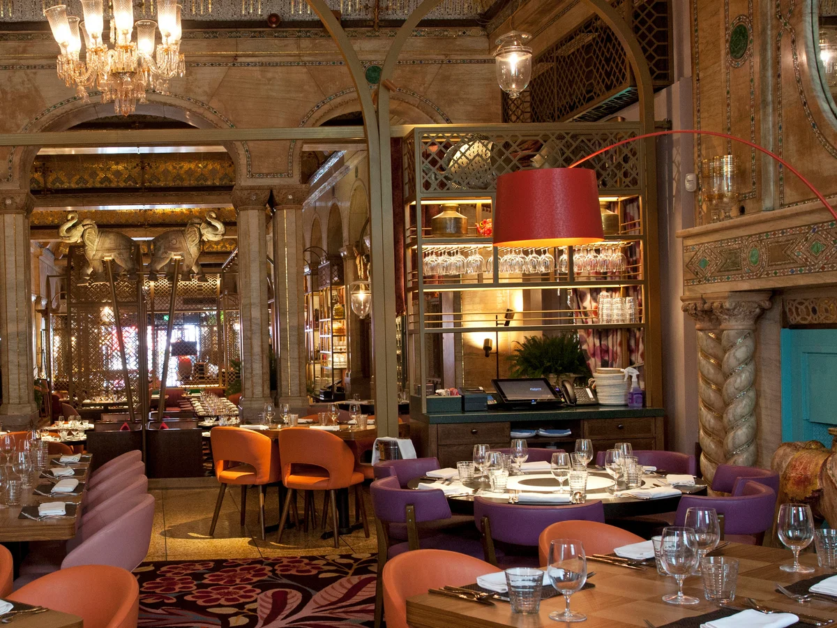 Elegant dining room with arched ceilings, intricate gold wall mosaics, and a mix of modern and classical Indian-inspired decor Masala Zone offers authentic Indian thali meals in a bright and welcoming space. About a 6-minute walk from Piccadilly Circus, you can enjoy a full plate of curries, rice, bread, and pickles, all carefully spiced and well-balanced. The vegetable thali is popular for those who want variety in one meal, while the chicken or lamb options are rich and satisfying.