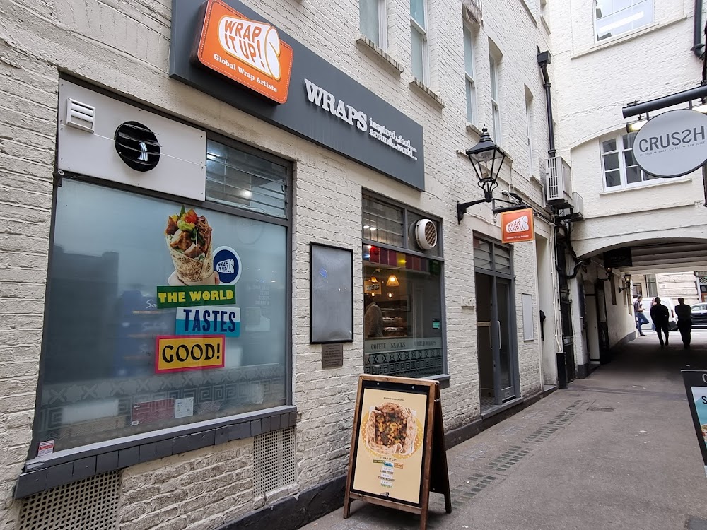Wrap It Up! shopfront and a Crush juice bar sign further down the alley under a classic street lamp Wrap It Up! specialises in quick wraps and sandwiches, ideal if you’re in a rush but still want something satisfying. A 5-minute walk from Piccadilly Circus, this small spot is perfect for grab-and-go lunches. The chicken tikka wrap is a winner, tender, spiced meat wrapped with fresh vegetables and a soft flatbread, making it both filling and portable.