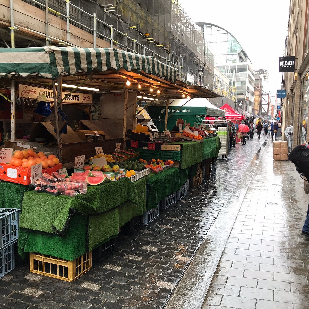 Berwick Street displaying fresh grapefruit, sliced watermelon, avocados, and citrus fruits under warm hanging light bulbs on a grey afternoon. Berwick Street Market offers quick, global eats in a bustling open-air setting. Only a 6-minute walk from Piccadilly Circus, it’s ideal for grabbing a flavorful lunch on the go. You’ll find everything from Mexican burritos to Thai noodle boxes, each portion packed with fresh ingredients and vibrant flavours.