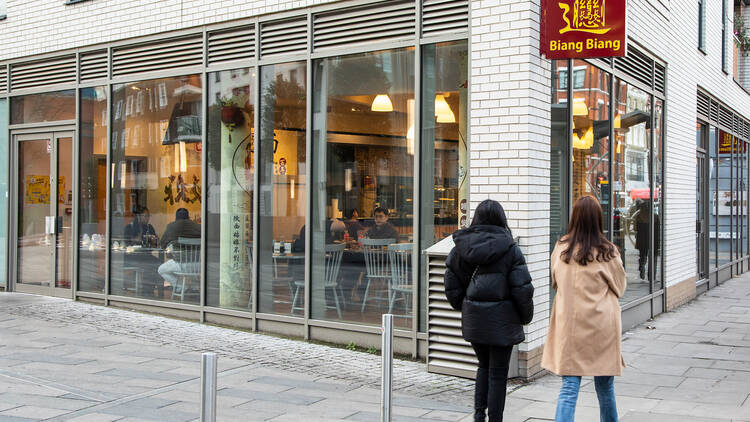 Biang Biang noodles restaurant in London, showing diners seated at light blue chairs inside a bright, contemporary dining room Known for huge hand-pulled Xi’an noodles, Biang Biang Noodles is ideal for anyone craving filling, flavorful food. A 5-minute walk from Piccadilly Circus, it’s convenient for lunch or an early dinner. The spicy beef noodles are generous, with thick, chewy ribbons coated in a chilli-spiced sauce that hits the perfect balance of heat and richness.