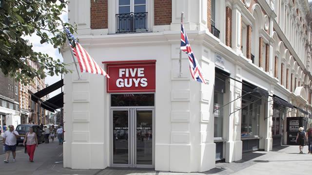 Five Guys restaurant located on Garrick Street in London, showing the classic white architectural details of the building and pedestrians walking by on a sunny day. Five Guys is a casual, no-frills American burger spot that’s perfect if you’re hungry and want something filling. About a 5-minute walk from Piccadilly Circus, this outlet is ideal for sharing with friends, splitting fries or burgers reduces the cost while keeping portions generous. The bacon cheeseburger with extra ShackSauce is a classic, juicy, and satisfying without feeling overdone.