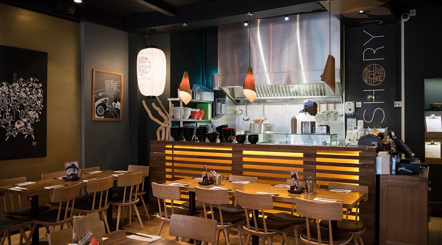 Shoryu Soho restaurant featuring modern wooden seating, an open kitchen with a chef, and Japanese paper lantern lighting Shoryu Soho is all about comforting, rich Japanese ramen. A 6-minute walk from Piccadilly Circus, it’s perfect for a filling lunch or dinner in the West End. The Gansho Tonkotsu ramen is a standout, featuring a creamy pork broth, tender noodles, and a perfectly marinated soft-boiled nitamago egg that adds depth to every bite.
