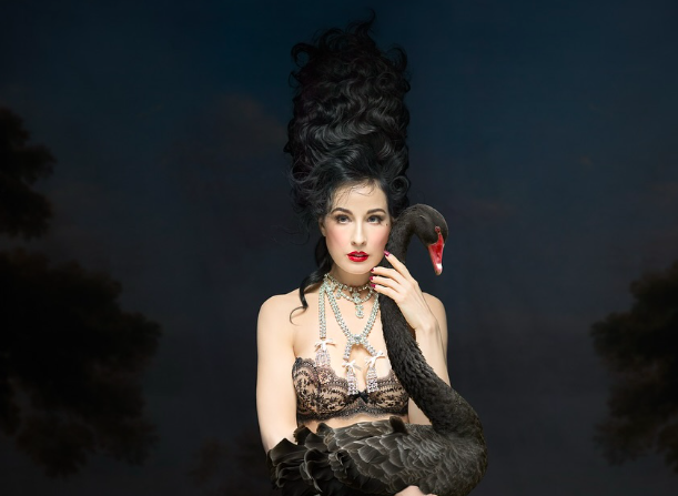 Von Teese became known for elevating burlesque into a theatrical spectacle. Her performances are characterized by elaborate props and costumes and a sense of old-Hollywood fantasy. Signature acts include routines like the Martini Glassand Champagne Glass, in which she emerges nude from a giant glass, as well as the Bird of Paradiseand Black Swannumbers featuring full-feather costumes.