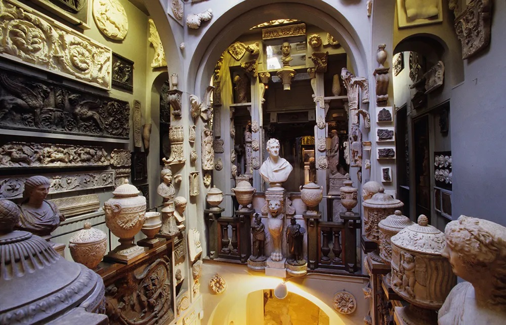 Soane collected antiquities, architectural fragments, and paintings - most famously Hogarth’s “A Rake’s Progress” - arranging them in intricate layers of visual dialogue. Mirrors amplify the light; hidden panels reveal secret galleries. The result is an intimate, poetic space that feels part museum, part dreamscape.