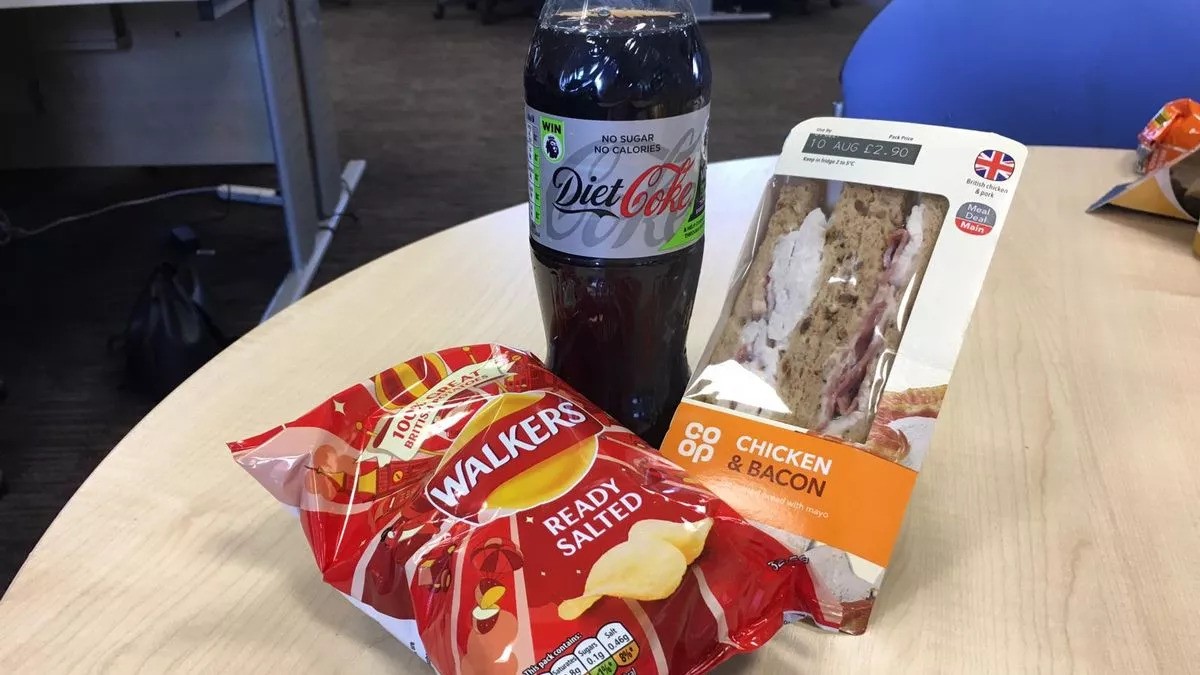 A sandwich, a bag of chips and a can of coke arranged on a wooden table Tesco sells a meal deal for £3.85 with Clubcard or £4.25 without. It includes a sandwich or wrap, a snack, and a drink. Sainsbury's charges £3.95 for everyone. Co-op members pay £3.50 and non-members pay £4.