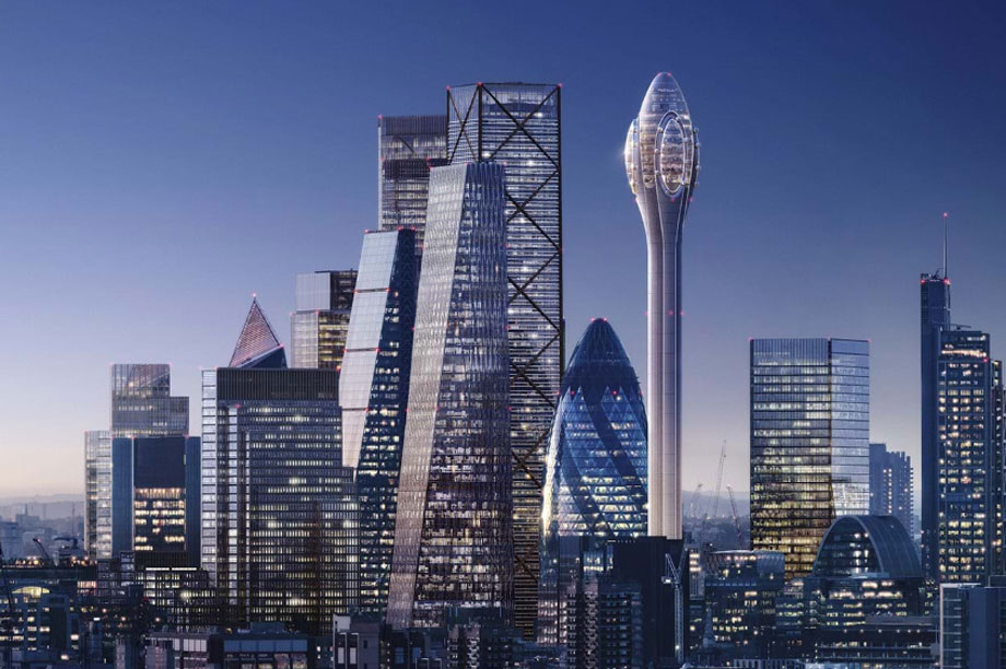 Modern London skyline at twilight featuring "The Tulip" tower alongside "The Gherkin" and other skyscrapers Day two shifts east to London’s oldest quarter a compact area where medieval fortifications stand beside glass skyscrapers.