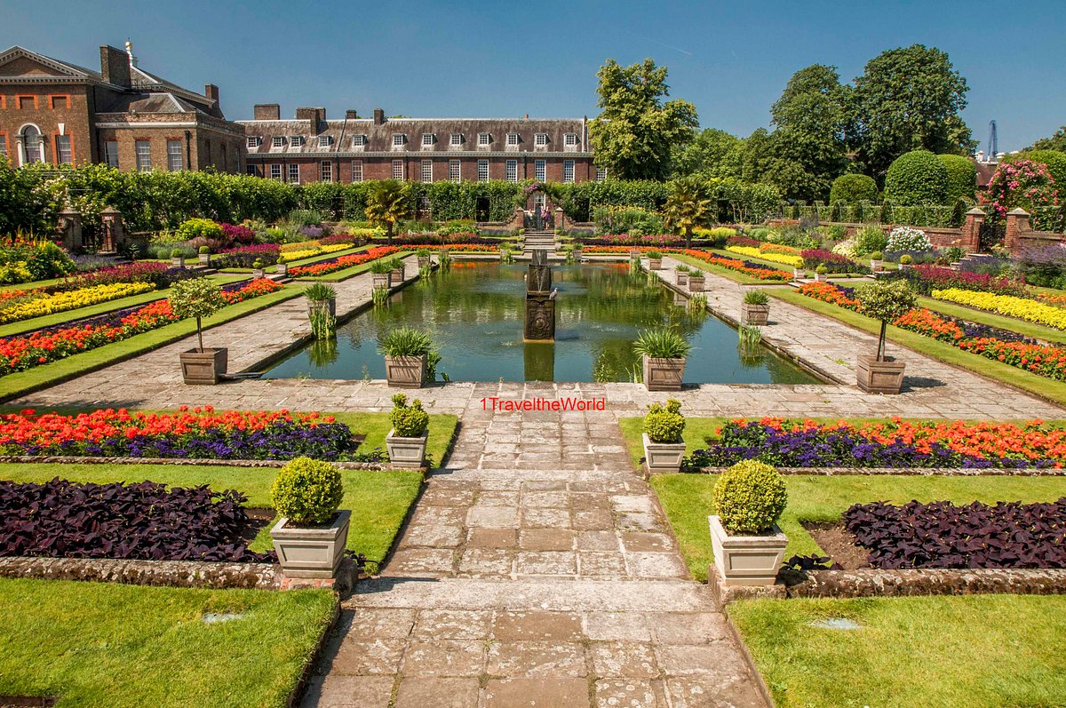 A formal sunken garden with a rectangular pond and central fountain, surrounded by vibrant, symmetrical flower beds, stone pathways, and a historic brick building in the background Day three balances indoor culture with outdoor spring beauty ideal for London’s variable March and April weather.