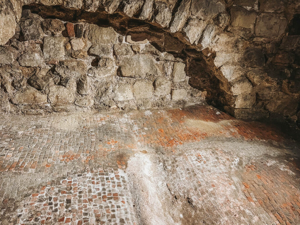 The site shows part of the original wall and a rounded bastion tower added later for stronger defense. Small displays show objects found during digging, such as pottery, coins, and medieval items. One highlight is a Roman roof tile marked with a cat’s paw print made while the clay was still wet.