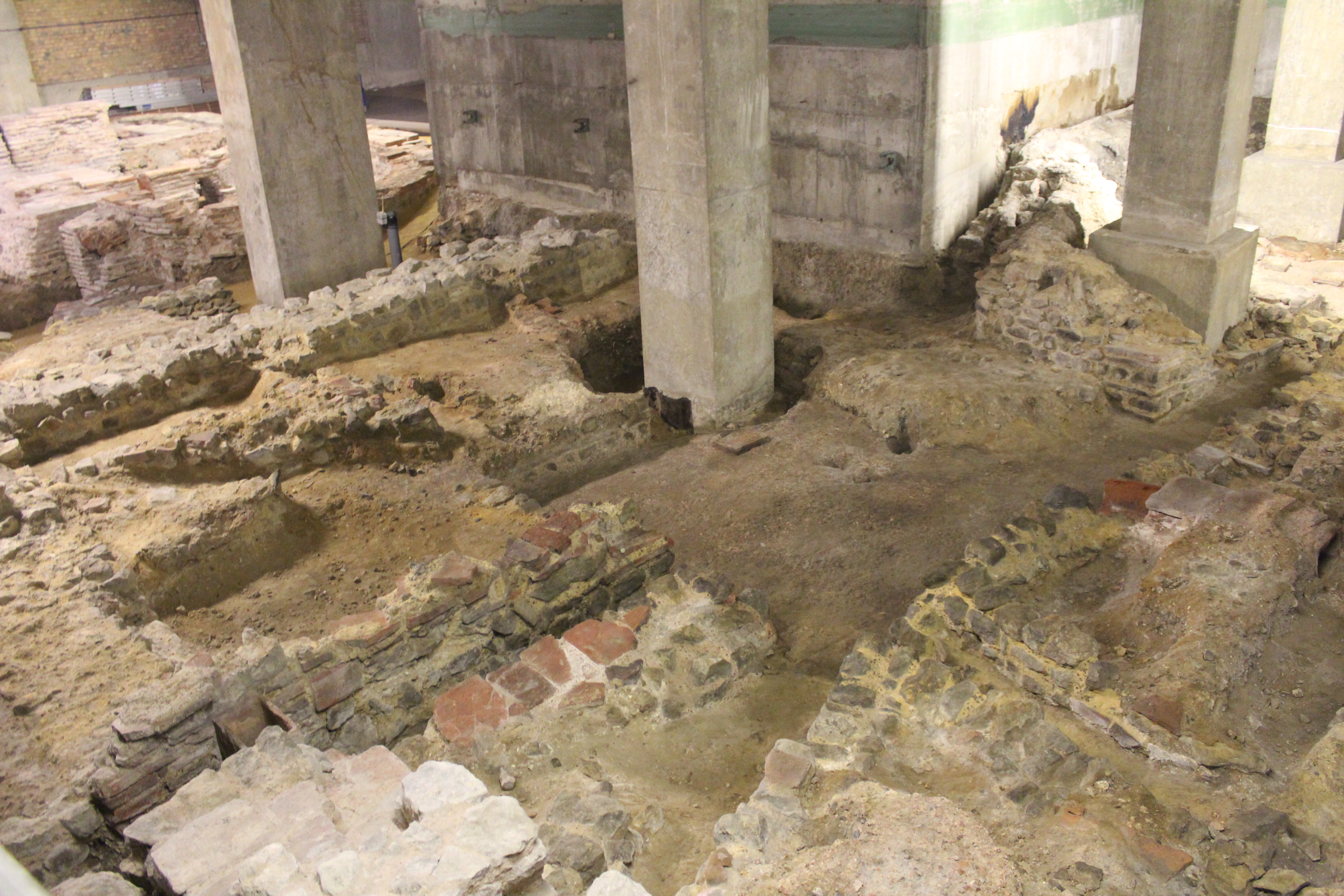 An archaeological excavation site revealing ancient Roman foundations and walls made of brick and stone Cleary Garden, near Mansion House station, is a small, quiet garden with flowers and seating. Beneath it once stood Londinium’s largest public bathhouse, the Huggin Hill baths, uncovered in the 1960s. The ruins were later covered again for protection, but signs in the garden explain what once stood here.