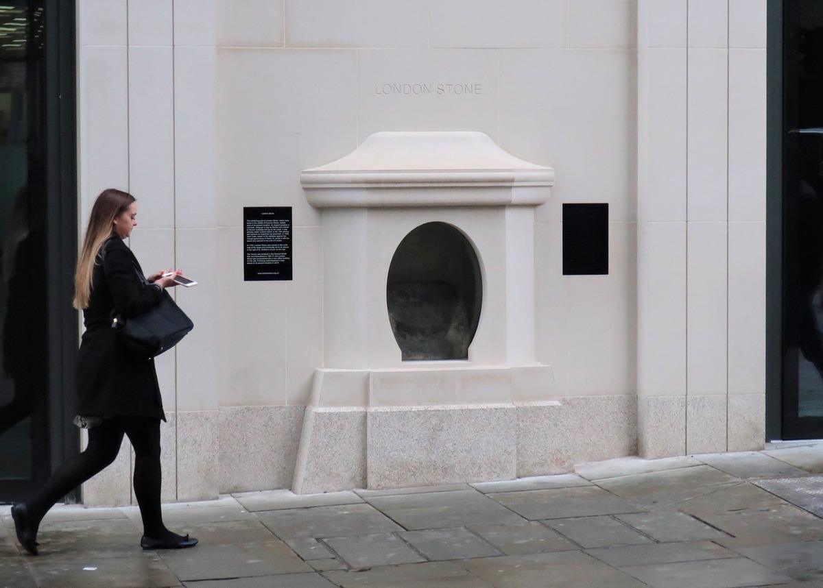 A woman passing by the London Stone, an ancient block of limestone encased in a modern white stone Set into the wall of a modern office building on Cannon Street is the London Stone, a small block of limestone that has puzzled historians for centuries. Many believe it dates back to Roman Londinium and may have marked an important central point in the city. It is first mentioned in records from around 1100, but its story is likely much older.