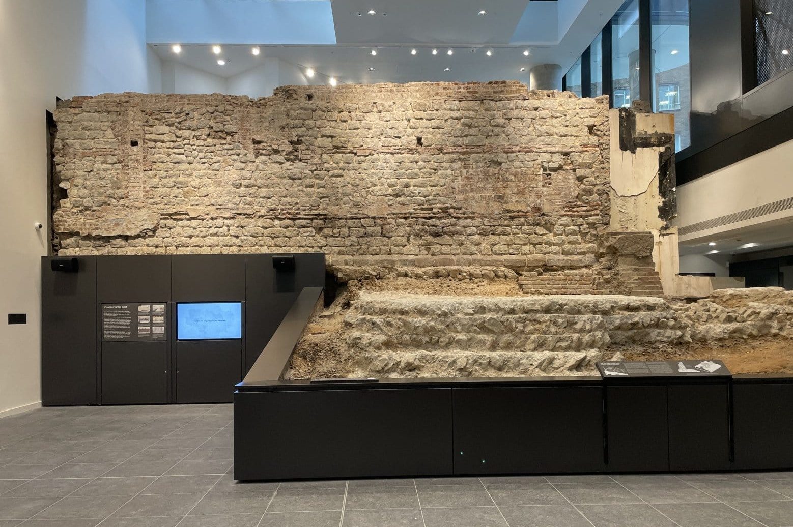 A large, excavated section of an ancient Roman stone wall displayed inside a modern museum Until 2023, a well-kept part of the Roman city wall and a defensive tower was hidden in an old office basement near Tower Hill. It is now open to the public on Vine Street, inside a modern space built around the ruins. You can step down and see the wall and tower clearly through large glass panels.