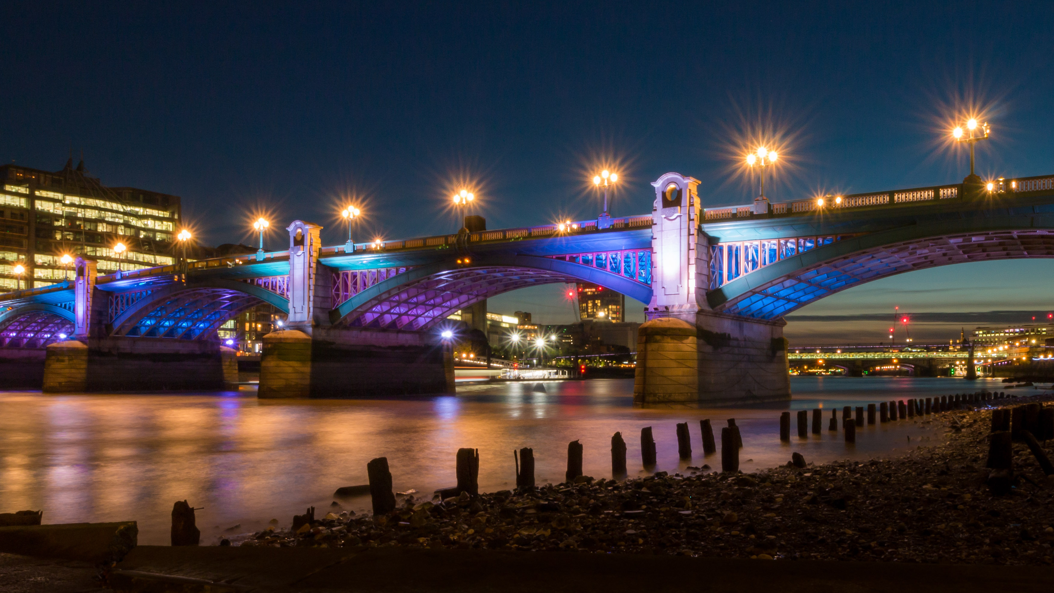 Southwark Bridge in London lit up with blue and purple lights Southwark Bridge draws inspiration from impressionist paintings with highly saturated colors, creating an artistic atmosphere. The color palette changes more dramatically here than on other bridges, with bold hues suggesting painted brushstrokes.