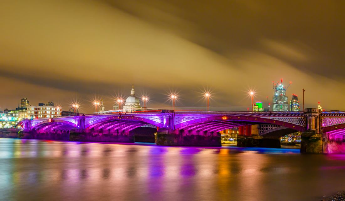 Blackfriars Bridge in London illuminated with purple lights Blackfriars Bridge illumination complements the red pillars supporting the structure. The bridge's distinctive red-painted columns make it immediately recognizable among Thames crossings.