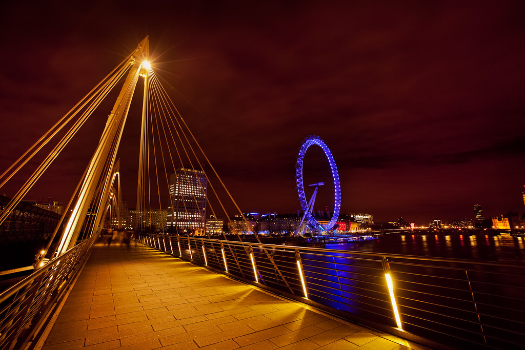 From this bridge, views extend in both directions: Westminster and the London Eyeto the west, the City's skyscrapers to the east. The lighting creates visual connections with landmarks visible from the bridge. Pedestrian view of the Golden Jubilee Bridges at night Golden Jubilee Footbridges receive monochromatic lighting mirroring the modern design of these structures. These twin pedestrian bridges flank Hungerford Railway Bridge, creating a three-span crossing.