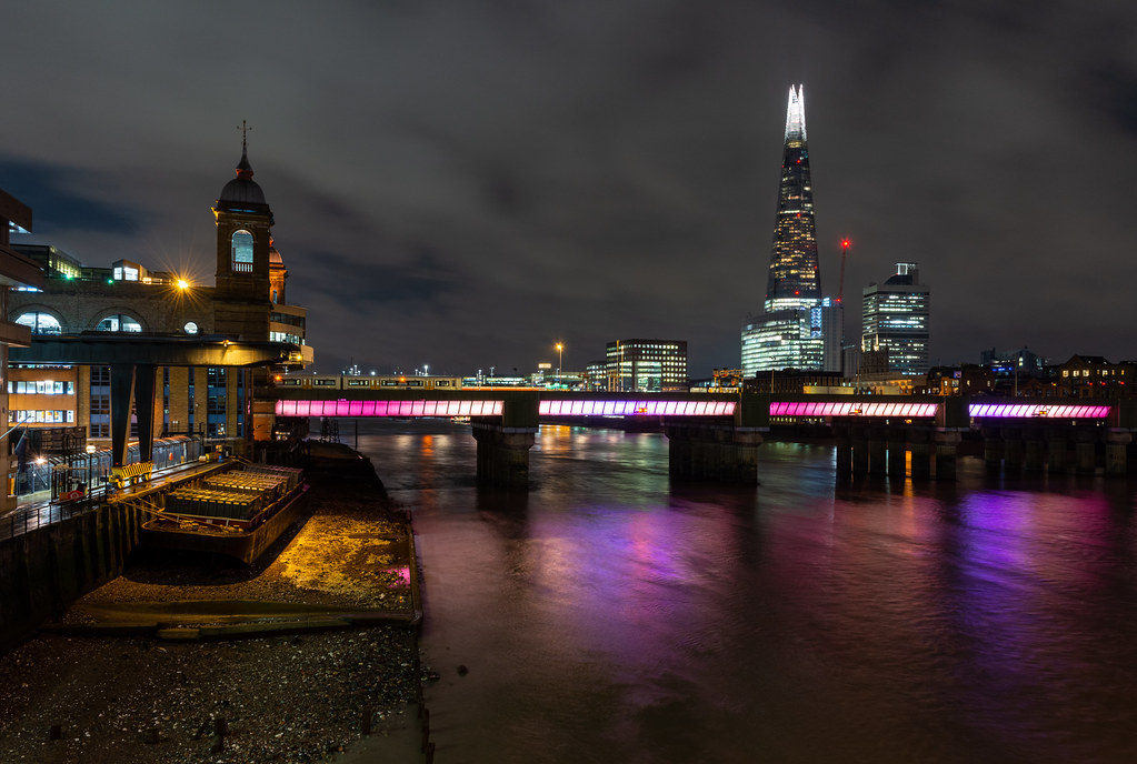 Night view of the London skyline featuring a glowing London Bridge and the illuminated Shard skyscraper The Cannon Street Railway Bridge features dynamic colors that complement the motion of trains running along the bridge. This functional railway crossing often goes unnoticed by tourists, but its illumination reveals its industrial beauty.