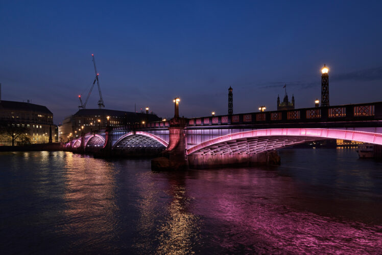 Lambeth Bridge in London illuminated with bright pink and white lights at night over the River Thames Lambeth Bridgereceives warm light radiating under handrails, working with the red underside of the bridge. The red color scheme connects to the House of Lords' traditional red theme. This bridge marks the western extent of the Illuminated River project. The warm tones create a gentle conclusion to the light sequence stretching from London Bridge.
