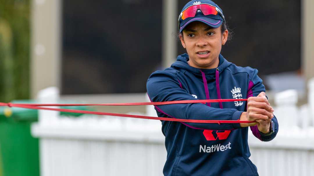 England cricketer stretching with resistance band at training Sophia Dunkley is a Londoner in biography and cricket geography. She was born in Lambeth, London.