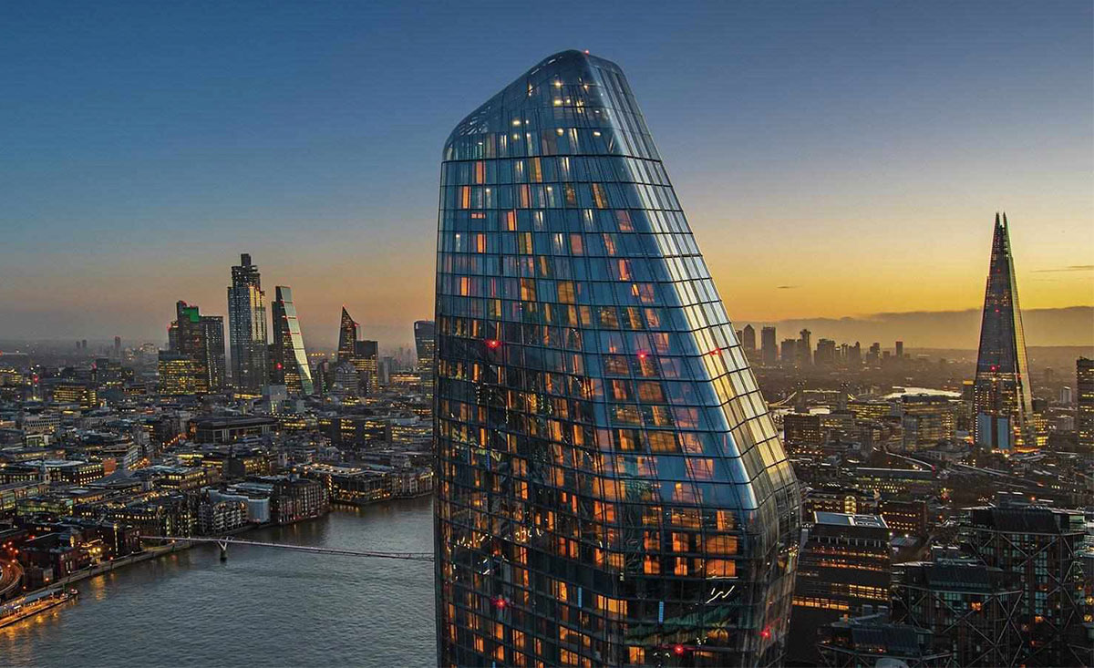 Luxury London skyscraper at sunset with glass facade, river view, and the city skyline At 163 meters, One Blackfriars rises like a curved glass sculpture on the South Bank. People call it “The Vase” or “The Boomerang” because of its flowing shape. Completed in 2019, it holds luxury apartments, a small hotel, and retail spaces. Standing right by Blackfriars Bridge, the tower adds a soft, elegant touch to the riverside skyline.