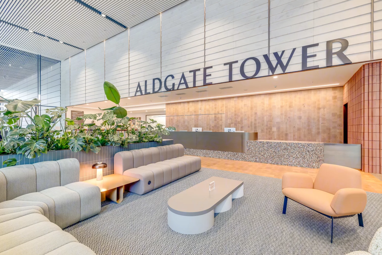 Modern, bright office lobby interior of Aldgate Tower, featuring large text signage, contemporary furniture, and potted plants Aldgate Tower rises to 87 meters and was completed in 2014 as part of the regeneration of Aldgate. Its simple glass design gives the area a fresher, more modern feel.