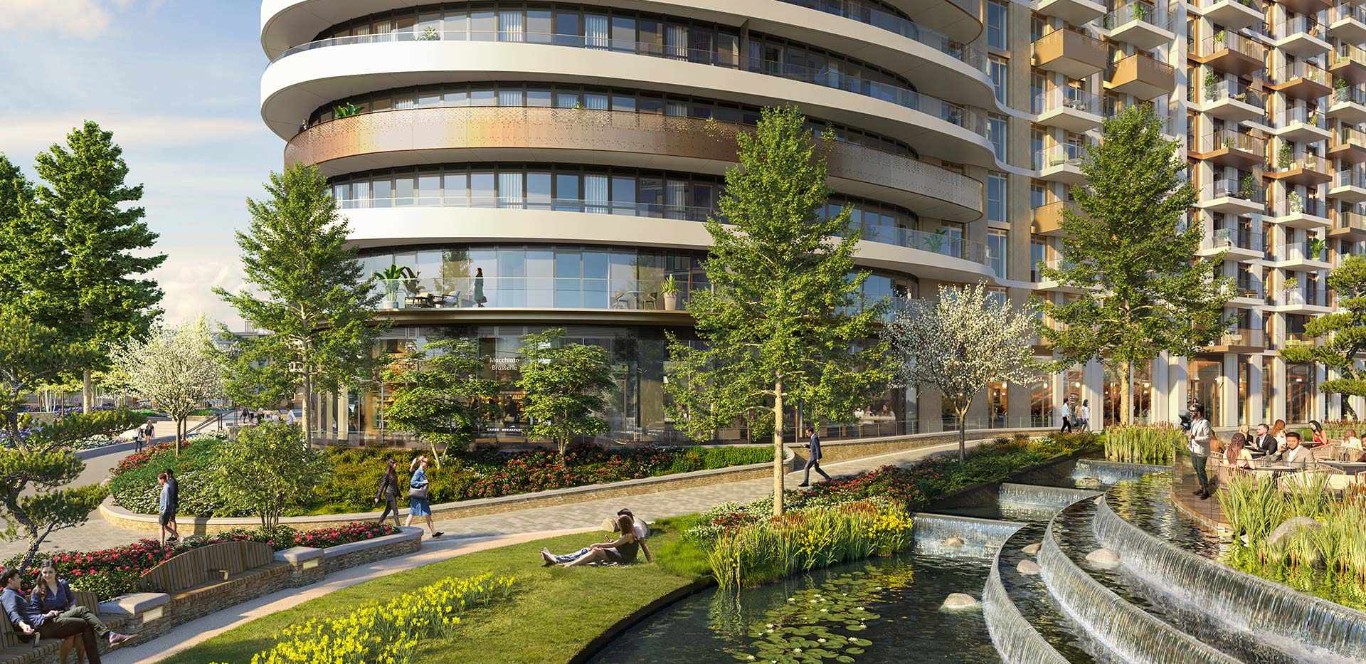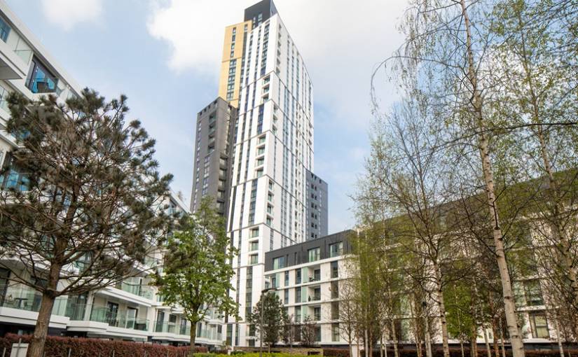 White City Living residential tower in London, featuring a modern curved facade, with a landscaped park and tiered water feature in the foreground White City Living Tower stands around 100 meters tall as part of the huge regeneration of West London’s old BBC district. Completed in the late 2010s and early 2020s, the development transformed the area into a mix of homes, parks, and retail spaces. From the upper floors, you can see all the way toward central London. The tower’s clean, white exterior gives it a bright and modern look.